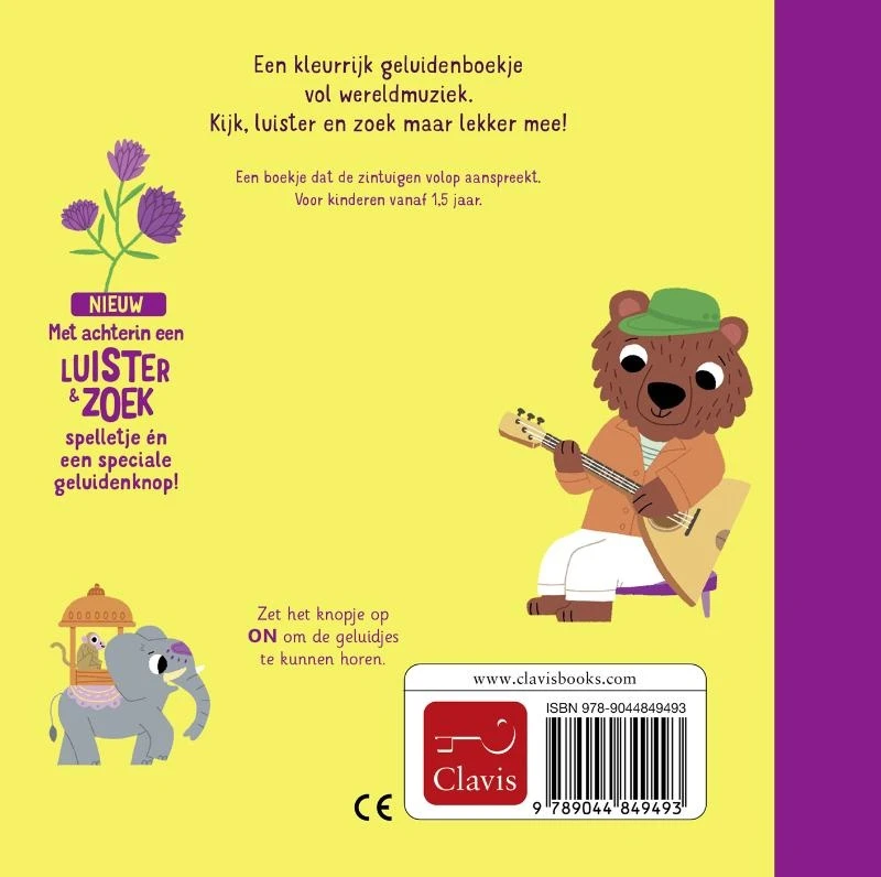 Een kleurrijk geluidenboekje vol wereldmuziek. Kijk, luister en zoek maar lekker mee! Een boekje dat de zintuigen volop aanspreekt. Voor kinderen vanaf 1,5 jaar.