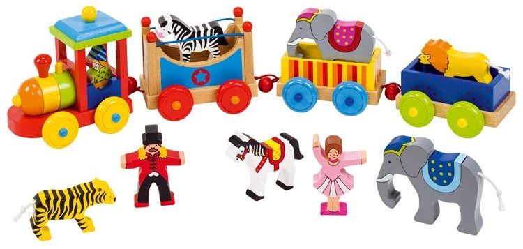 Met deze houten trein Livorno van Goki zullen de kinderen tijden bezig zijn. Een locomotief met 3 wagons waarin de circusdieren vervoerd kunnen worden. Vrolijk gekleurd.