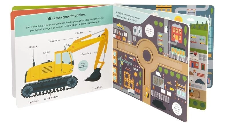 In het dikke kartonboek ‘Een rondje over de bouwplaats’ maken lezertjes eerst kennis met een groot voertuig dat gebruikt wordt in de bouw. Daarna kunnen ze het zelf een rondje laten rijden! Met hun vinger kunnen ze de bulldozer, graafmachine, kiepwagen en