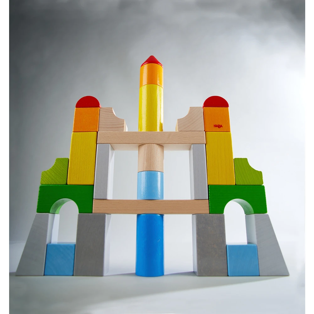 De kleurrijke blokken stimuleren de fantasie van jonge bouwmeesters en bevorderen de oog-handcoördinatie en fijne motoriek. Door de combinatie van kubussen, balken, ronde zuilen, bruggen en torenspitsen ontstaan telkens weer nieuwe bouwwerken.
