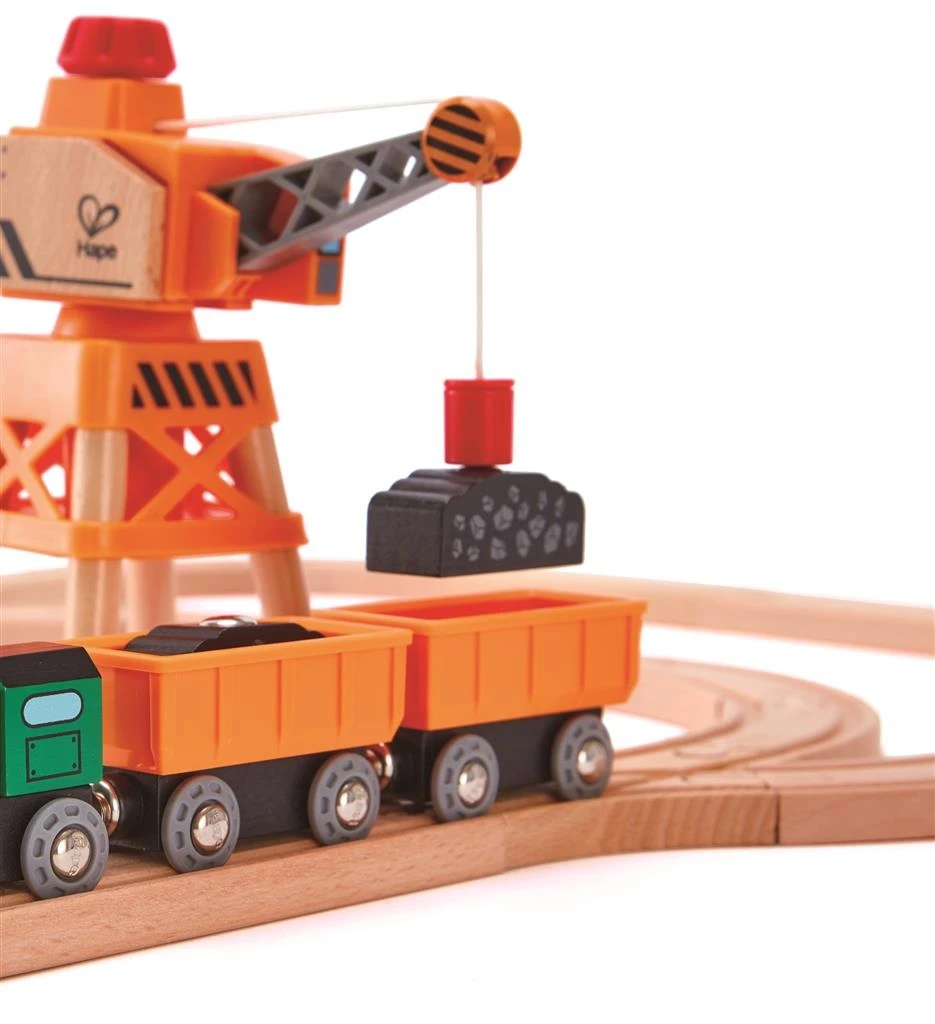 Breng met deze diesel goederentrein van Hape de lading naar het losstation. De goederenwagons bevatten ertsblokken die met de magneetkraan eruit getakeld kunnen worden.