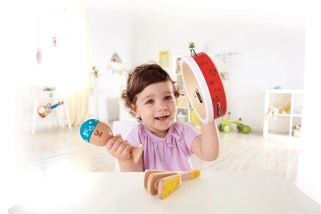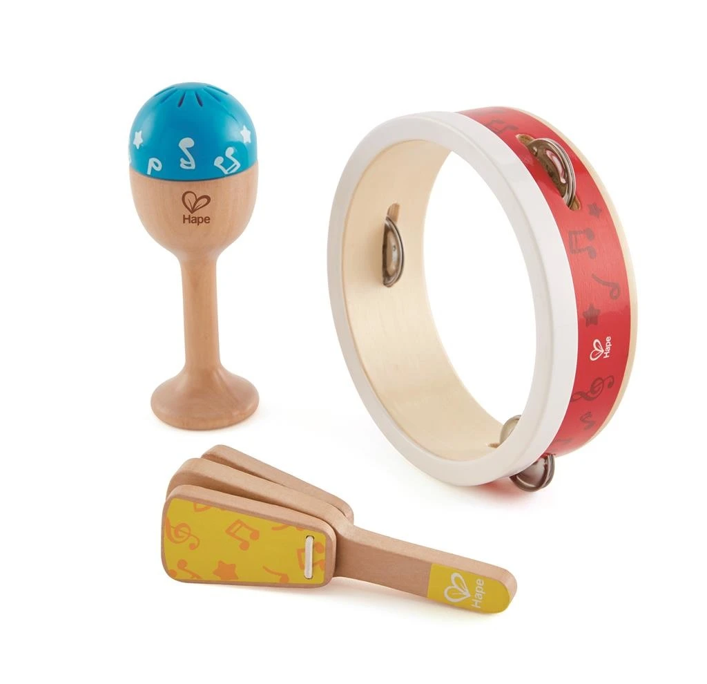 Deze driedelige percussie set van Hape bestaat uit een tamboerijn, maraca en een klapper. Verken de tonen van de verschillende muziekinstrumenten. Goed om alleen mee te spelen of sluit je aan bij de andere muzikanten.