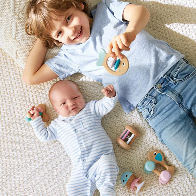 Deze prachtige speelgoedcollectie groeit met je kleintjes mee en helpt hun ontwikkeling bij elke stap. Met rammelaars en stevige bijtkralen voor baby’s, een rammelaar die blijft zitten als ze groot genoeg zijn voor op tafel