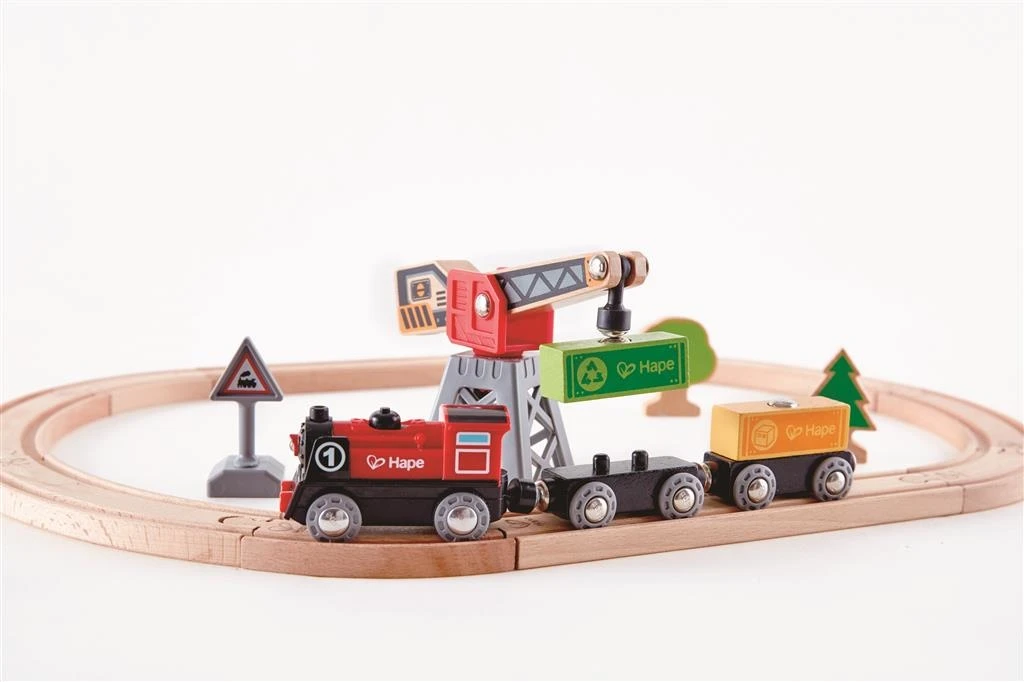 Gebruik de magneetkraan van deze treinbaan om de wagons te lossen of te laden. De treinset van Hape wordt compleet geleverd met een locomotier, wagons, rails en een magneetkraan.