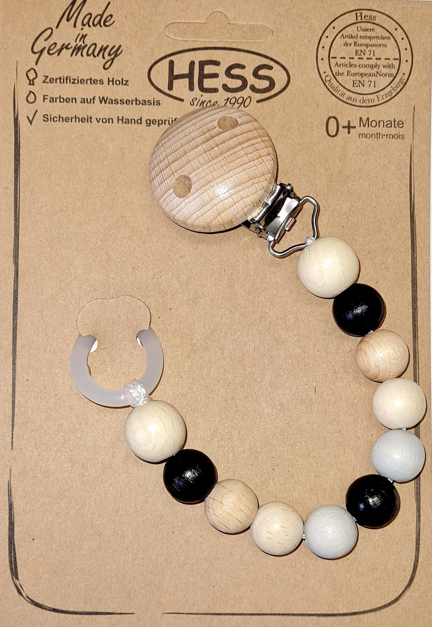 Dit speenkoord is gemaakt van Europees hout in Duitsland. De speenketting van Hess is voorzien van clip en een ring.