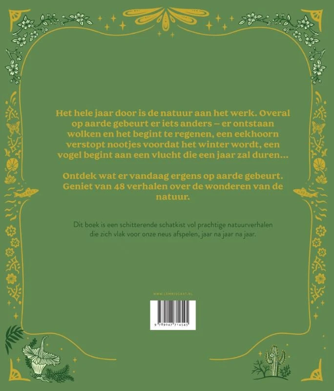 een eekhoorn verstopt nootjes voordat het winter wordt, apen nemen een stoombad, een heel land kleurt roze, er verschijnt een maanboog achter een regenval, een vogel begint aan een vlucht die een jaar zal duren… Op 48 schitterend geïllustreerde spreads worden verhalen verteld over dieren en natuurverschijnselen. Over elke maand lees je vier verhalen, elk uit een ander werelddeel, want als het hier winter is, is het ergens anders zomer. Is het droog op de ene plek, dan regent het elders. Maak een wonderlijke wereldreis vanaf je lievelingsleesplek. Een boek dat je laat wegdromen bij de oneindige schoonheid van onze planeet.