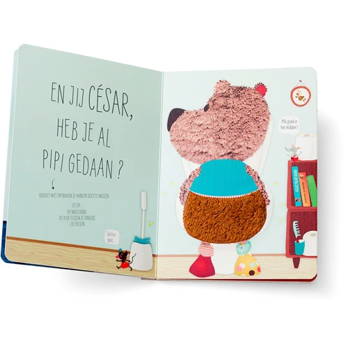 Dit boek van Lilliputiens behandelt alles van het in bad gaan tot het knuffelen. NL talig, op elke pagina is iets te voelen, zoals de billen van César, Louïse strepen van de pyjama. De hangmat van George is knuffelzacht. Achterin het boek is een spiegel.