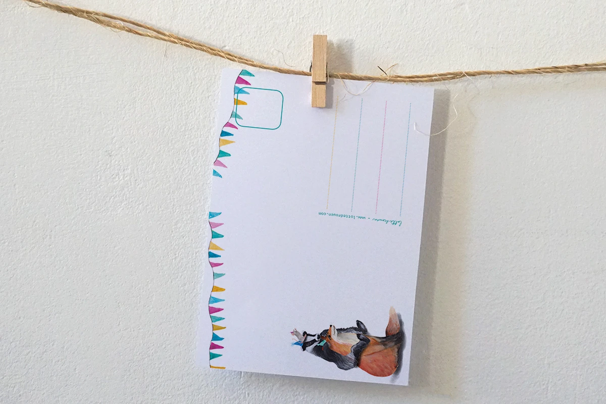 De illustratie van de kaarten van Lotte Drouen zijn door haar persoonlijk met de hand getekend en worden in kleine oplages gedrukt op mooi en dik structuurpapier. Het is zo net een klein schilderijtje. Ook de achterkant van de kaart heeft een mooi ontwerp met kleurrijke lijntjes voor de naam, adres, woonplaats en postzegel en natuurlijk ook nog een leuke illustratie.