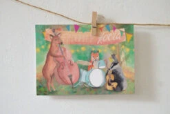 Vrolijke verjaardag- of felicitatiekaart met een band vol dieren. Een mooie originele illustratie die verstuurd kan worden met een verjaardag of andere gelegenheid of die als uitnodiging voor een feestje kan dienen. Daarnaast kan je hem natuurlijk ook bij
