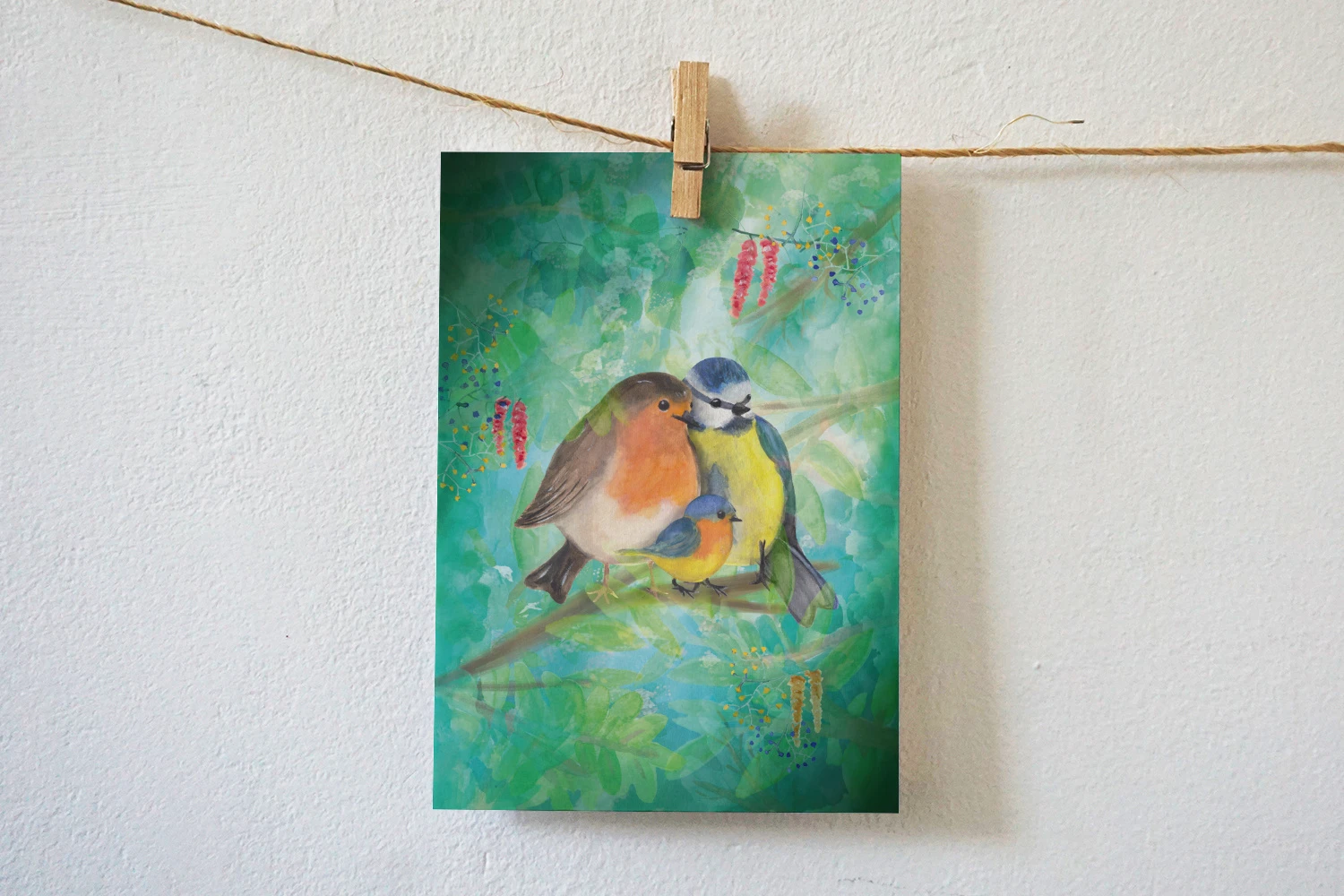 Kaart vogelgezin in het groen! Een lieve originele illustratie die verstuurd kan worden om iemand te feliciteren met de geboorte van een kleine, zwanger of gewoon zomaar. Maar ook mooi voor aan de muur. Daarnaast kan je hem natuurlijk ook bij een cadeau s