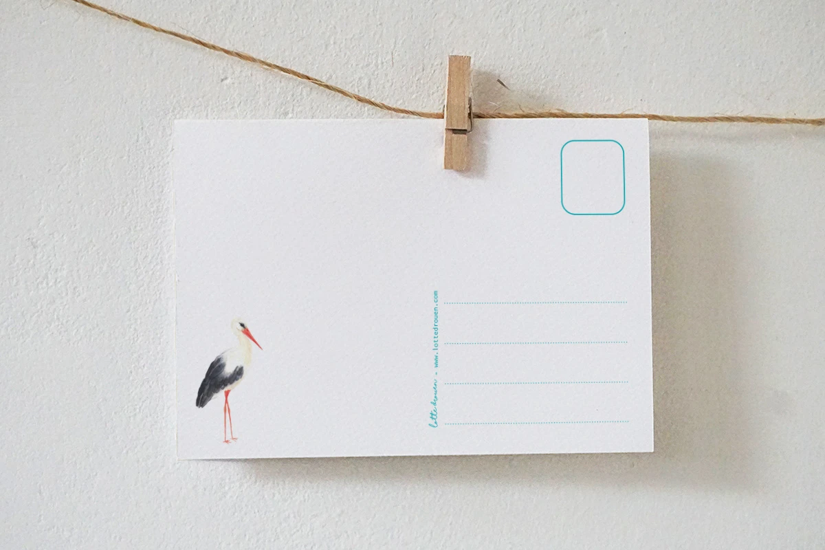 De illustratie van de kaarten van Lotte Drouen zijn door haar persoonlijk met de hand getekend en worden in kleine oplages gedrukt op mooi en dik structuurpapier. Het is zo net een klein schilderijtje. Ook de achterkant van de kaart heeft een mooi ontwerp met kleurrijke lijntjes voor de naam, adres, woonplaats en postzegel en natuurlijk ook nog een leuke illustratie.