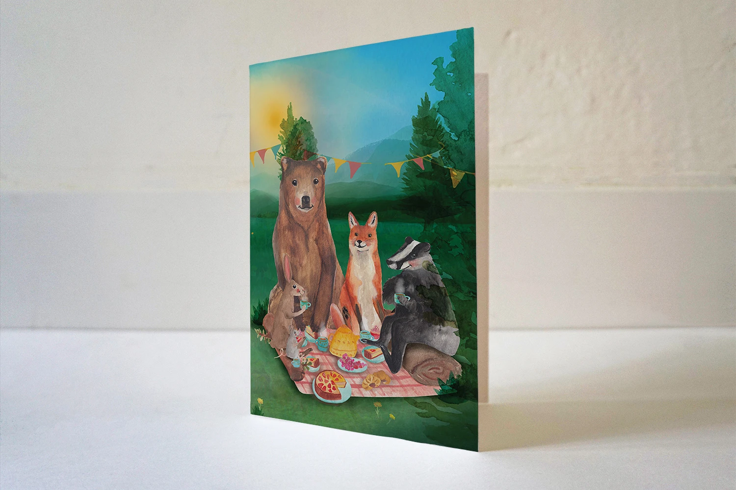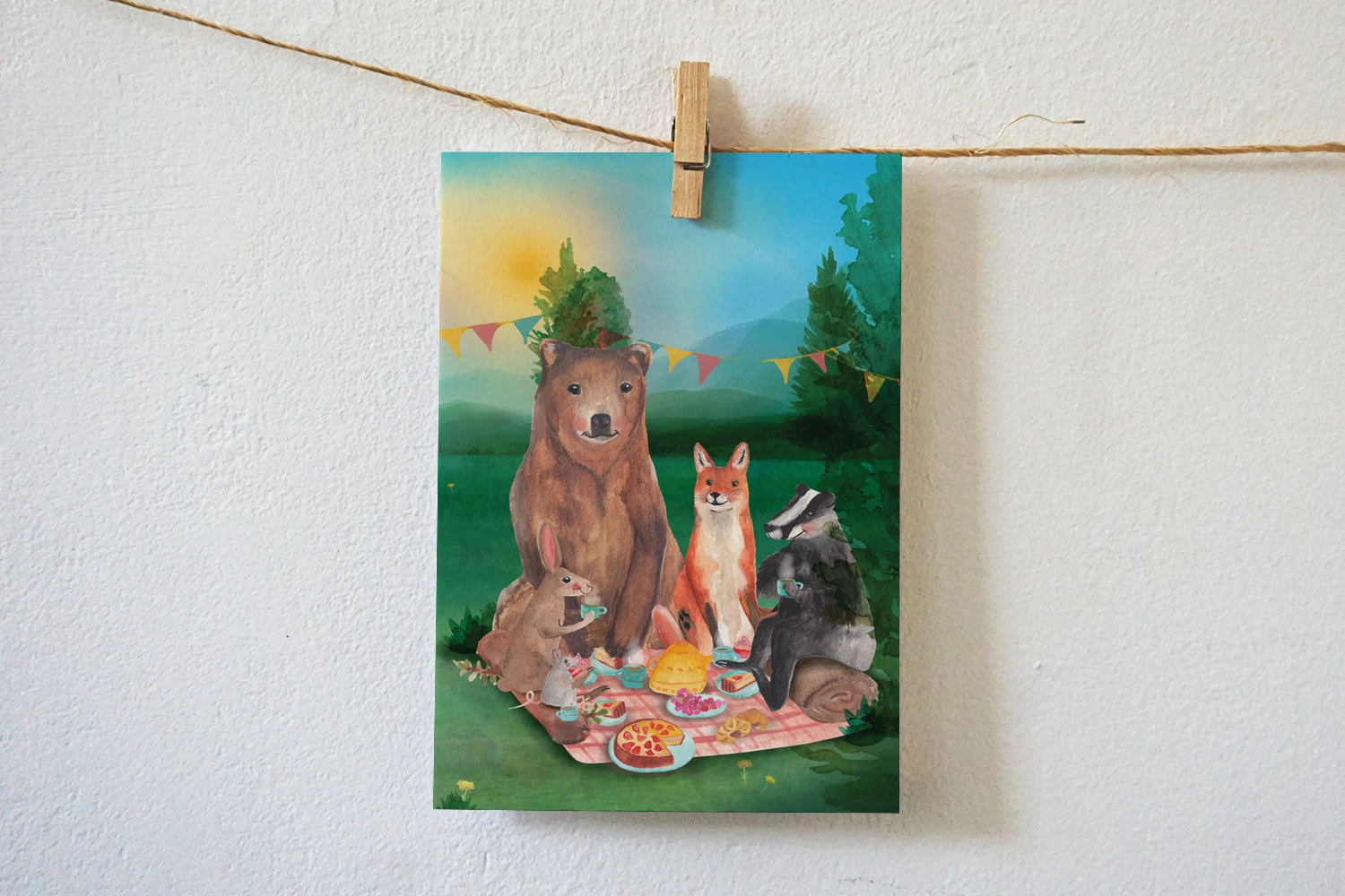 Lekker picknicken samen met bosdieren! Een betoverende wenskaart die het leven viert door aan te schuiven bij deze heerlijke picknick. Er is altijd wel een goede reden te bedenken om een mooi kaartje te sturen! Ook kan je de kaart natuurlijk in een lijstj
