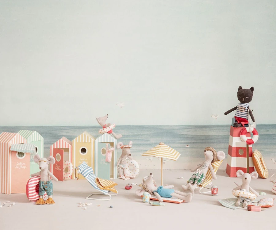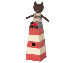 Vakantietijd. Alle populaire stranden hebben hun eigen badmeester. Deze kat van Maileg waakt over alle zwemmers. In de nacht kan de toren veranderen in een vuurtoren die schepen in de goede richting leidt.
