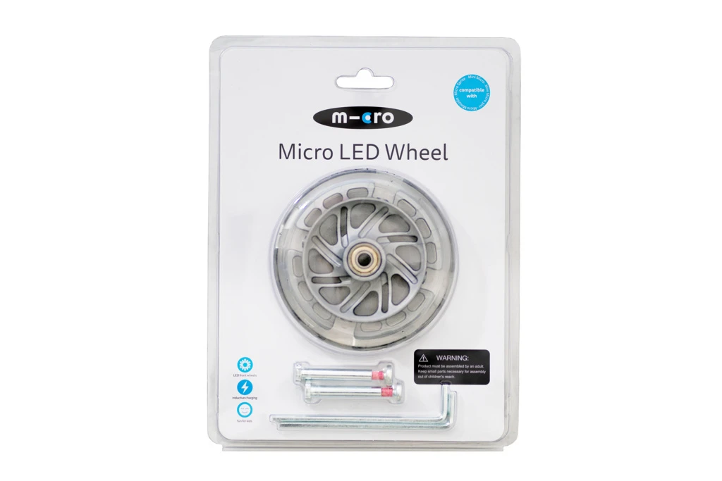 Deze LED wielset van Micro Step past op de Mini Micro. Als het donker is dan lichten de wielen wit op. Als de wielen draaien dan gaan de LED lampjes vanzelf aan. De wielen hebben een transparante PU buitenkant en komen met grijze spaken.