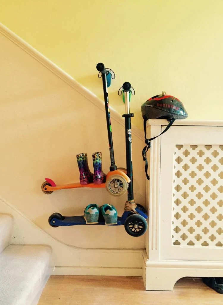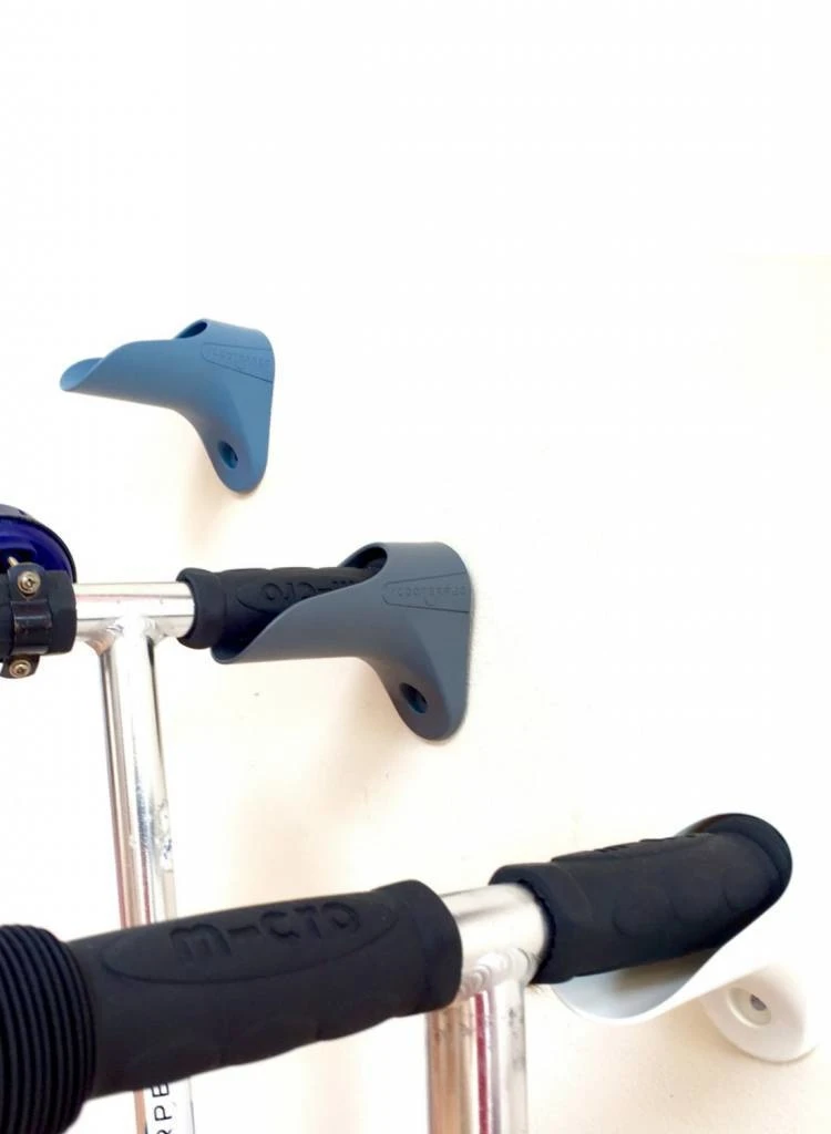 Een slimme haak waaraan je de Micro Step thuis op kunt hangen. Makkelijk te bevestigen. Zo staan de steps niet in de weg in de gang of schuur en blijft alles netjes opgeruimd. Geschikt voor kleine en grote 3 wielige steppen. De haak is fel blauw gekleurd.