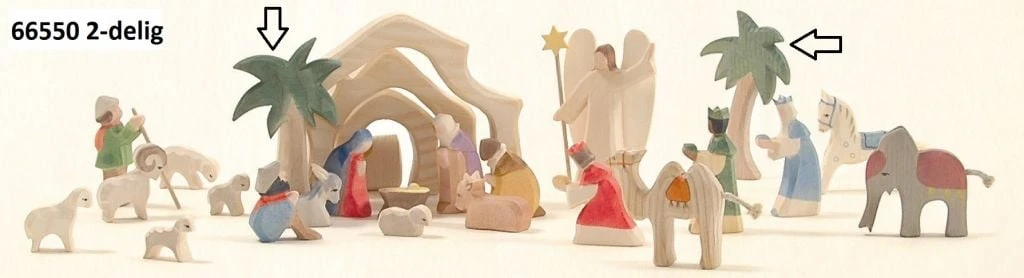 Dit is de 2-delige palmenset uit de serie Mini van Ostheimer. Deze groep past goed bij de miniatuur stal. De 2 palmen worden in een mooi houten opbergdoosje geleverd. Hoogte 12 cm.