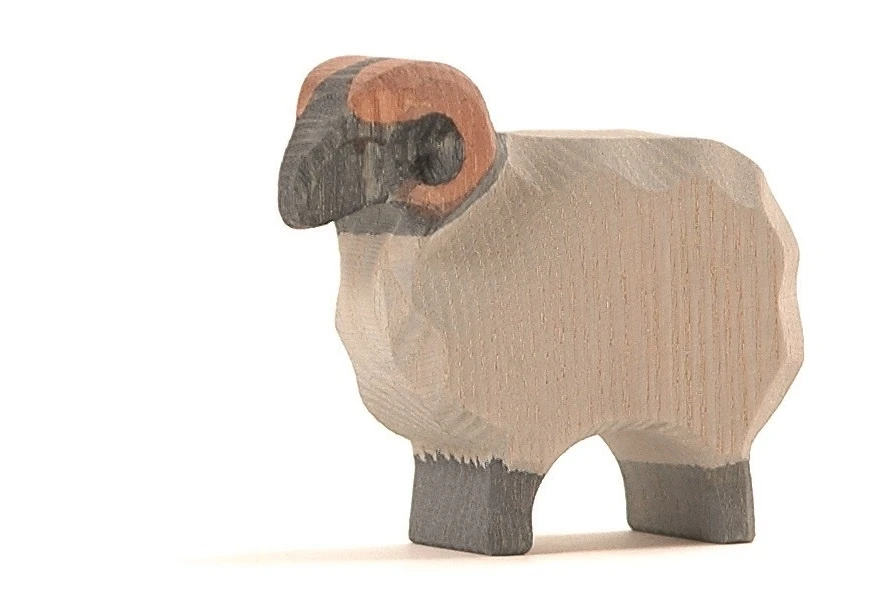Deze heide ram van Ostheimer staat rechtop. Dit heideschaap is met de hand gemaakt van inheems geteeld hout. Hoogte: 7.5 cm