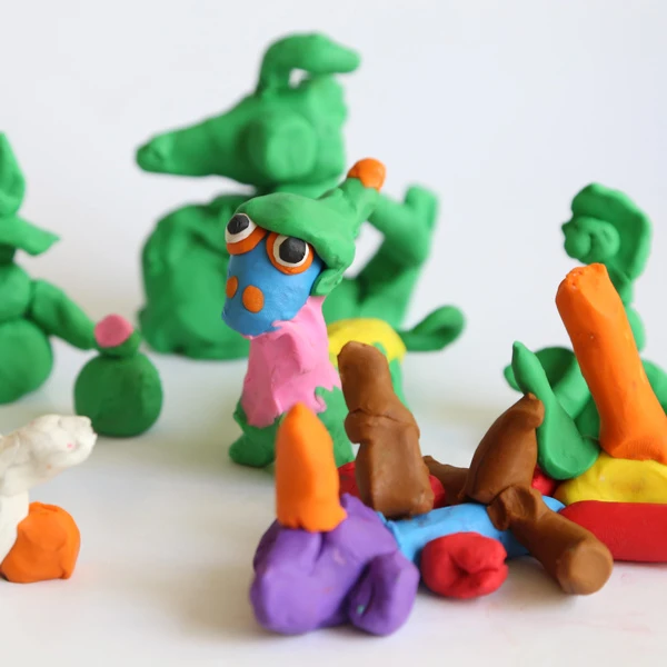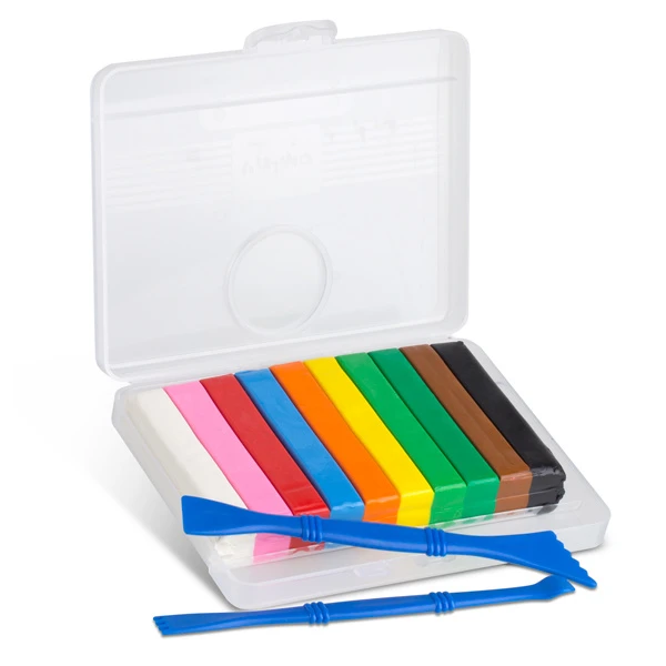 Deze set kneedklei bestaat uit 10 kleuren klei en 2 kunststof mesjes in een handige opbergdoosje.