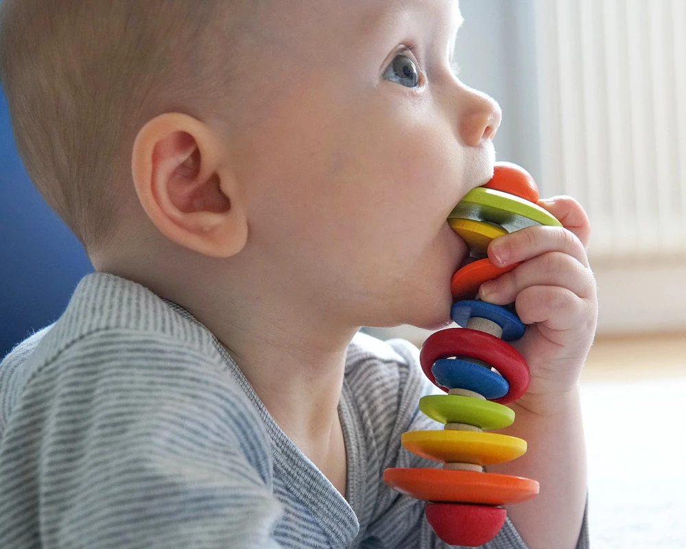 Makkelijk gepakt! De beweeglijke, ovalen schijfjes en de rode ratelende ring met een stevig houten handvat zorgen voor een kakelbonte klepperende afwisseling en wiebelig rolplezier.