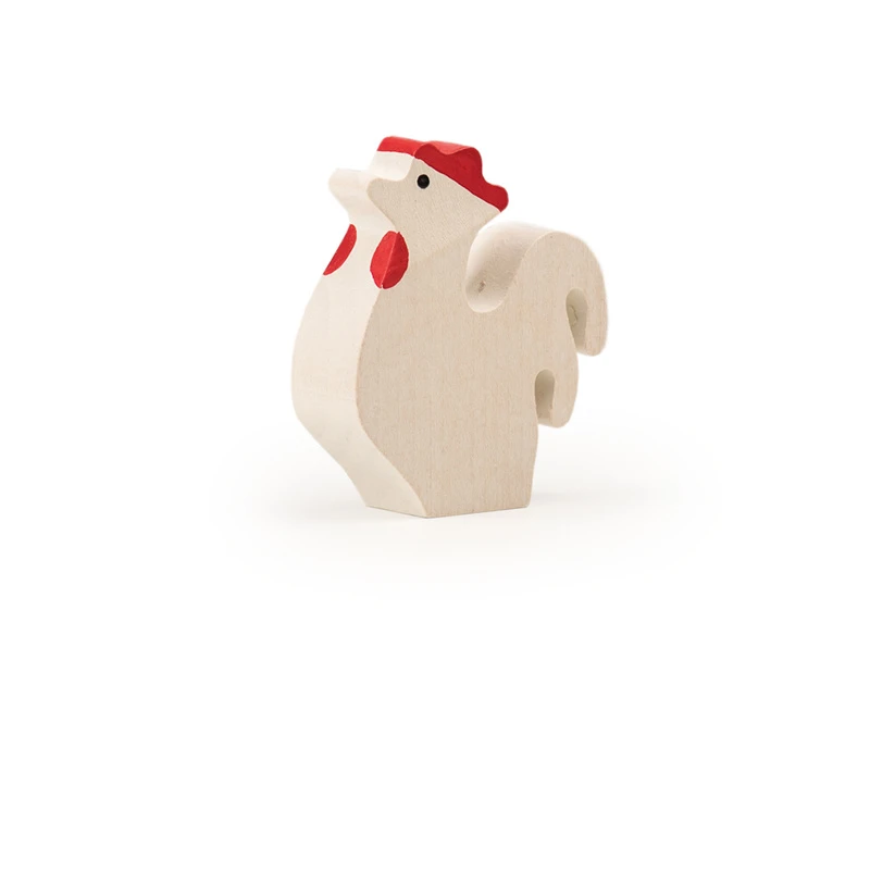 Deze haan van Trauffer staat rechtop en is met de hand gemaakt van lindehout in Zwitserland, de gebruikte verf is vrij van chemicaliën. De witte haan is robuust genoeg om mee te spelen. Hoogte: 4 cm.