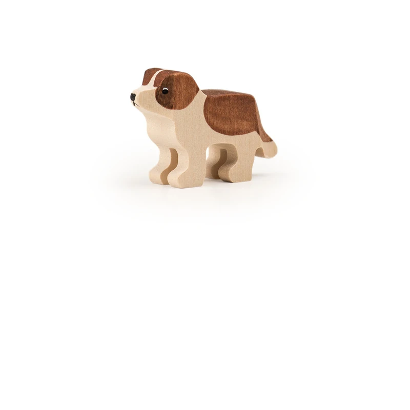 Deze Sint Bernard pup van Trauffer staat lekker rustig en kijkt ondertussen naar je, is met de hand gemaakt van lindehout in Zwitserland, de gebruikte verf is vrij van chemicaliën. Barry is robuust genoeg om mee te spelen. Hoogte: 3.5 cm.