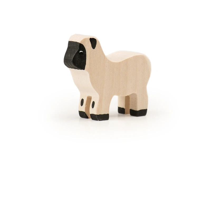 Dit zwartneusschaap van Trauffer staat rechtop en is met de hand gemaakt van lindehout in Zwitserland, de gebruikte verf is vrij van chemicaliën. Het schaap is robuust genoeg om mee te spelen. Hoogte: 4.2 cm.
