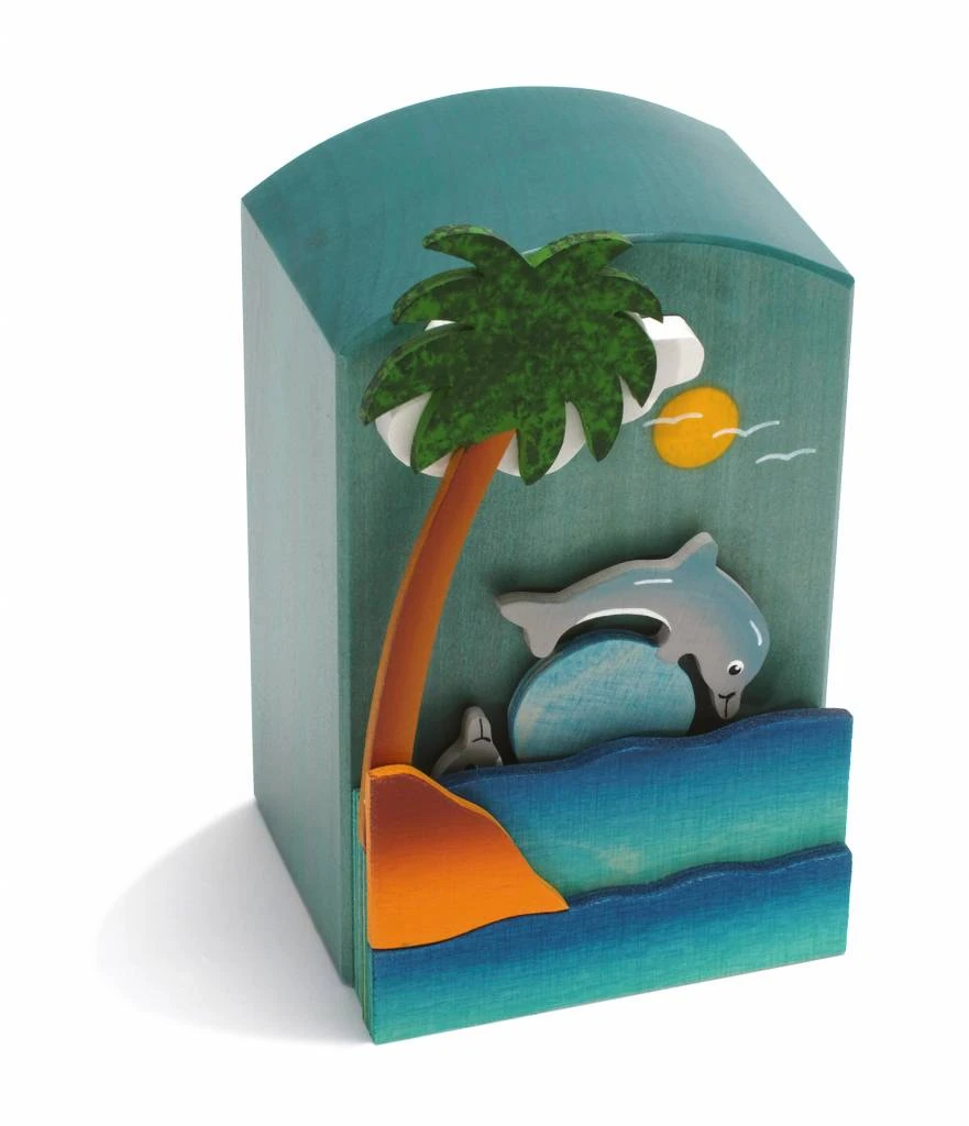 Een muziekdoosje in de vorm van een tropisch landschap met een dolfijn in de zee. Door aan de achterkant de muziekdoos op te winden en daarna aan te zetten gaan de dolfijnen draaien. Handgemaakt in Zwitersland door Weizenkorn.